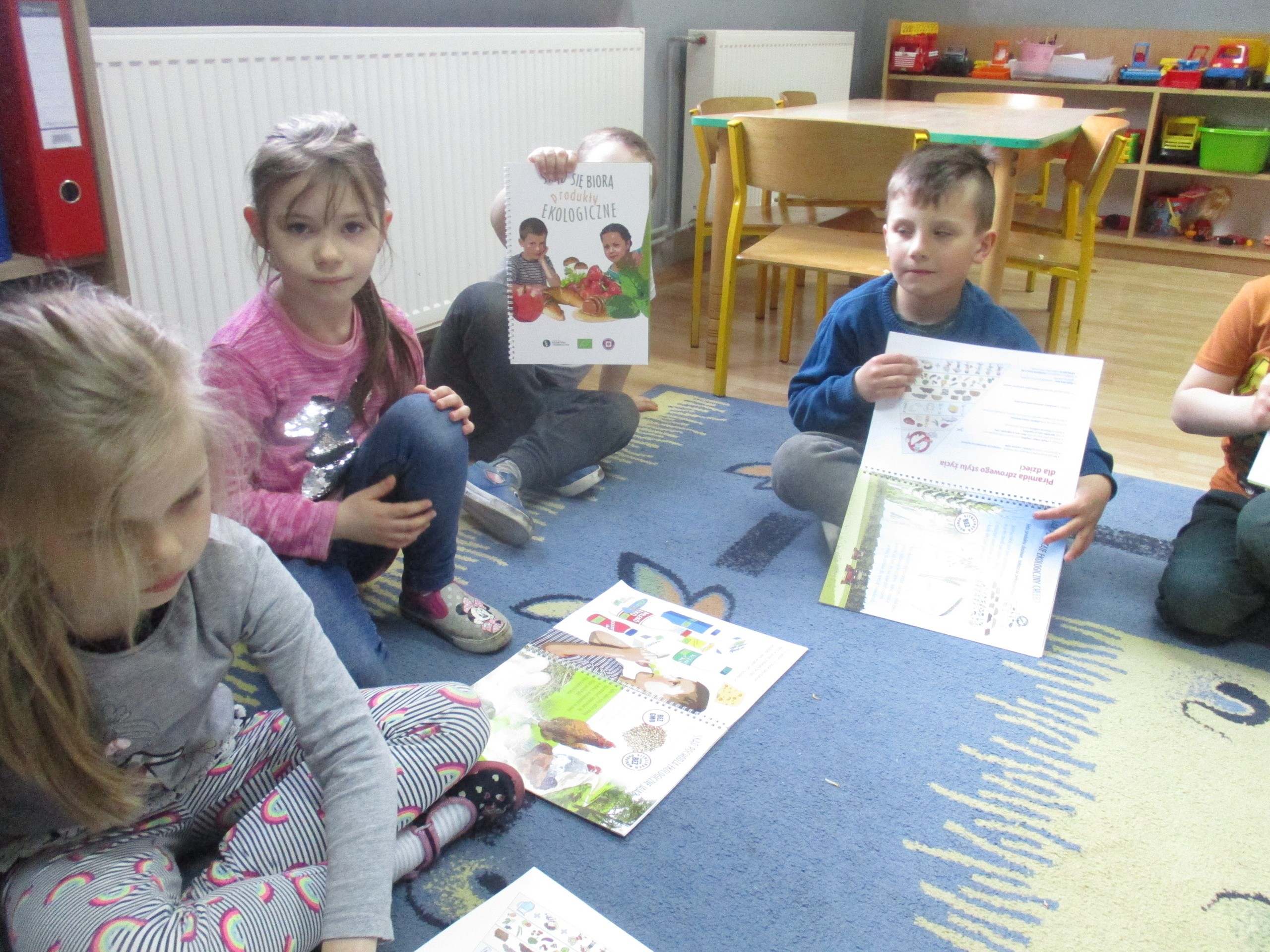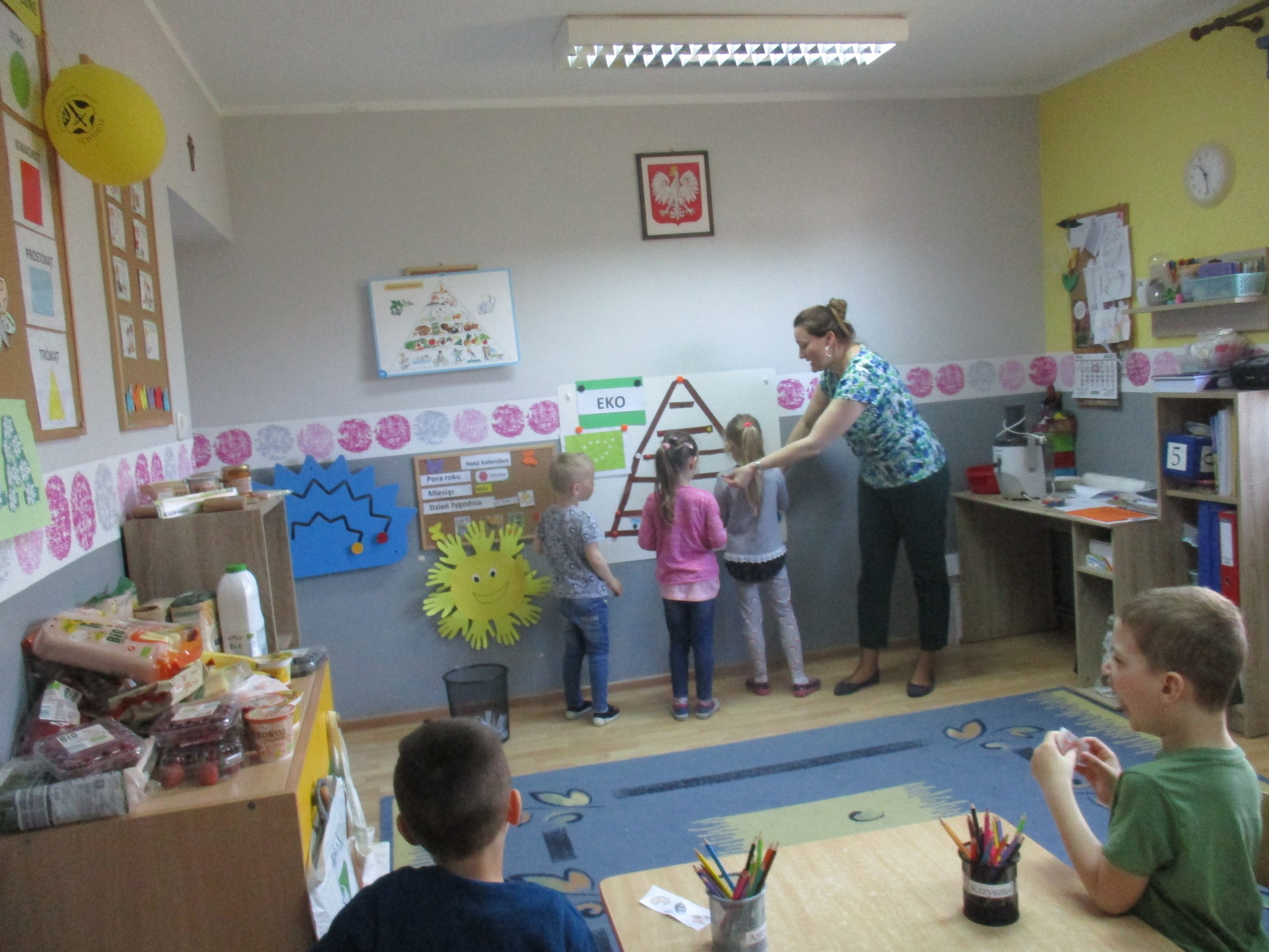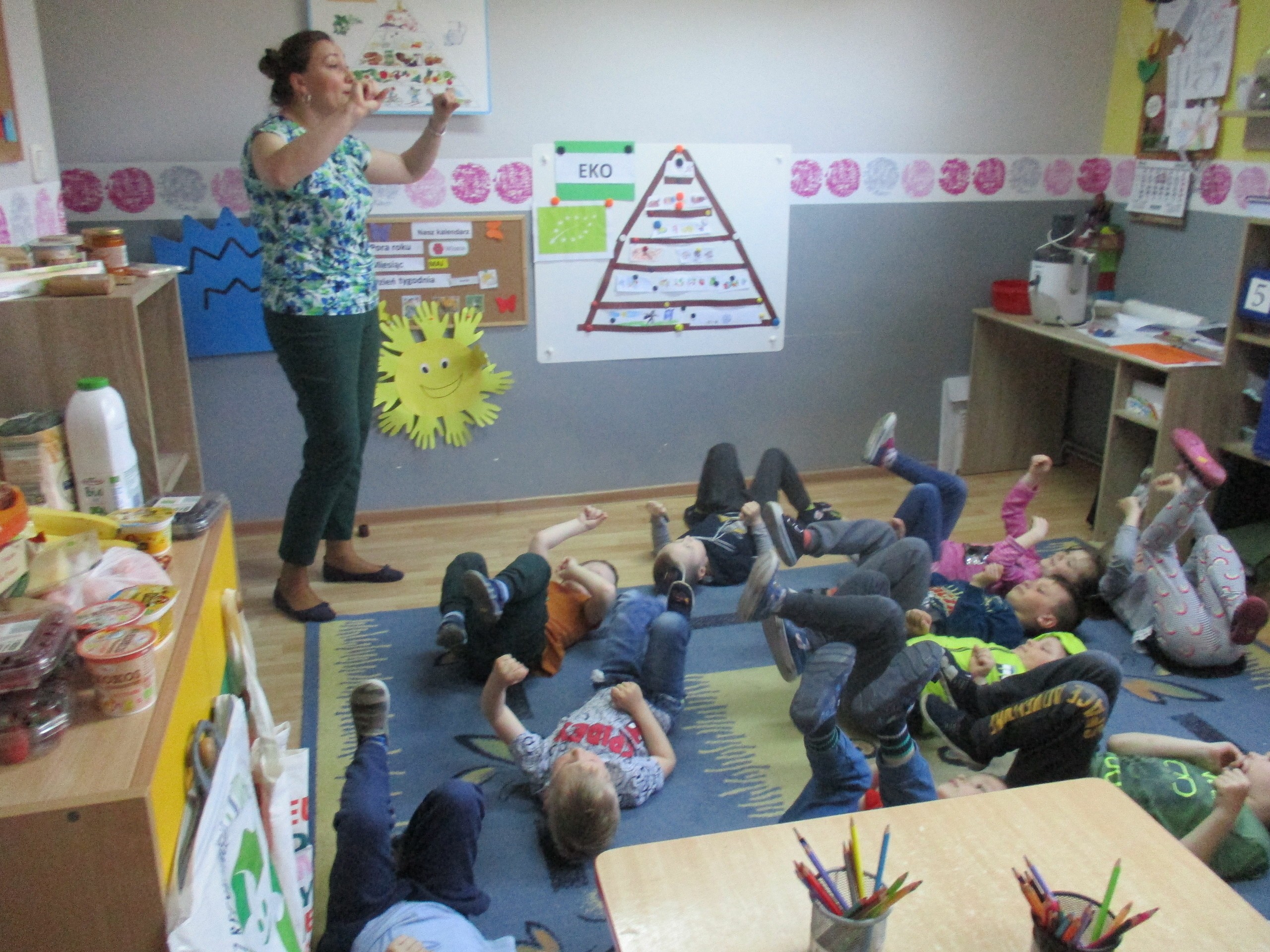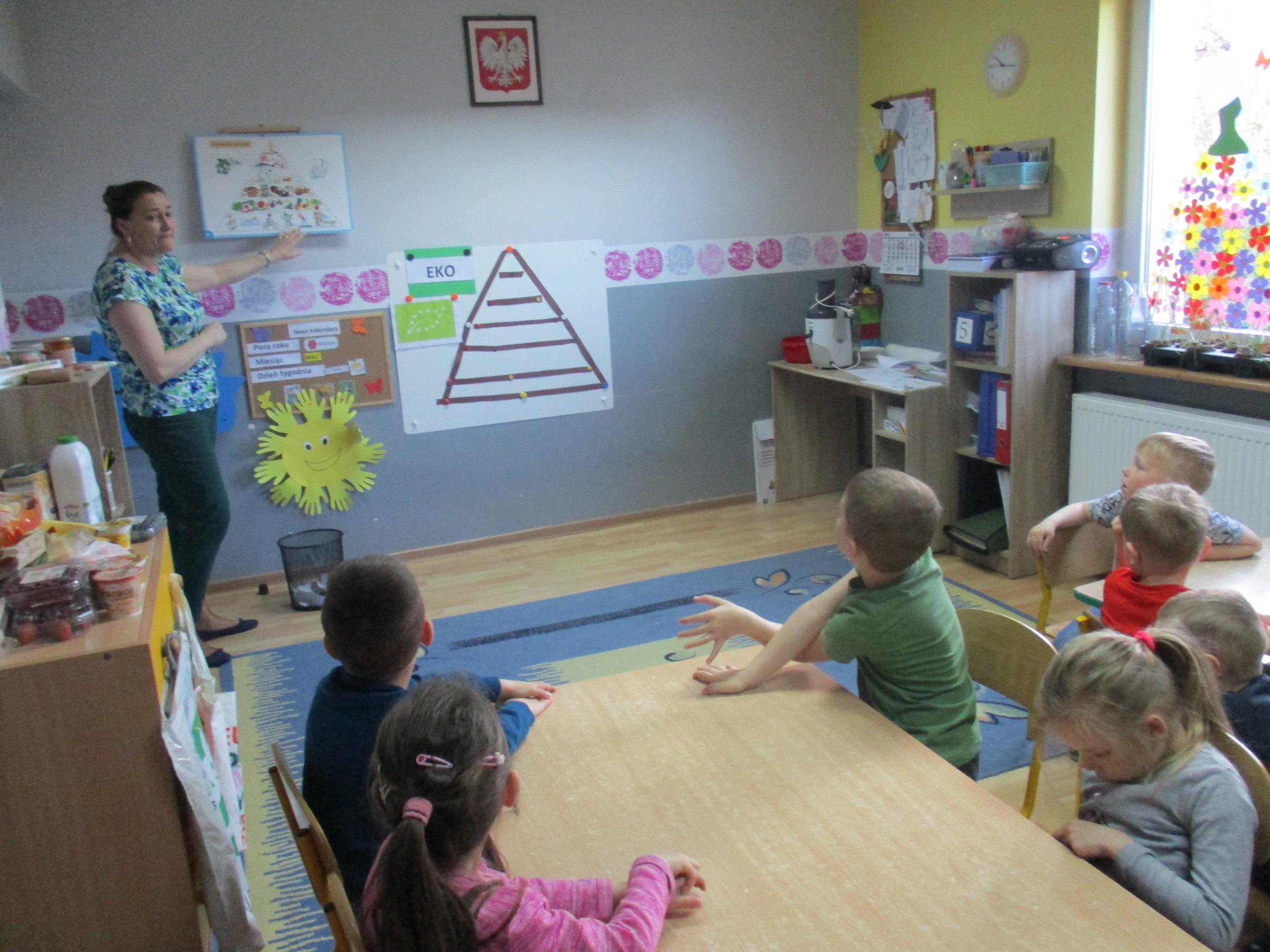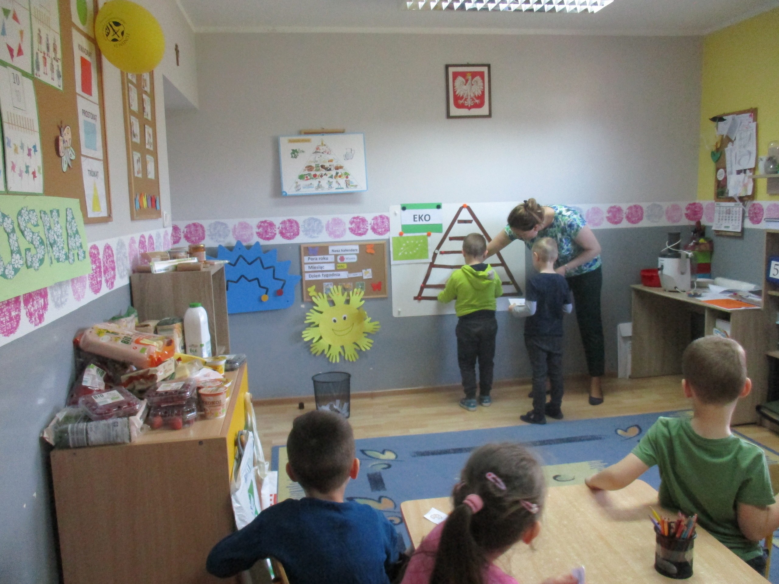 Podczas zajęć dzieci poznały wiele produktów ekologicznych oraz znaczek EKO jaki znajduje się na opakowaniu tych produktów. Obejrzały film pt. “Skąd się biorą produkty ekologiczne?”, uważnie śledząc proces ich powstania. Wspólnie utworzyły Piramidę Zdrowego Żywienia i Stylu Życia oraz realizowały jej zawartość. Spróbowały niektóre produkty ekologiczne np.; chipsy, flipsy, maliny, borówki, marchewkę a także pijąc sok ze świeżo wyciśniętych jabłek.