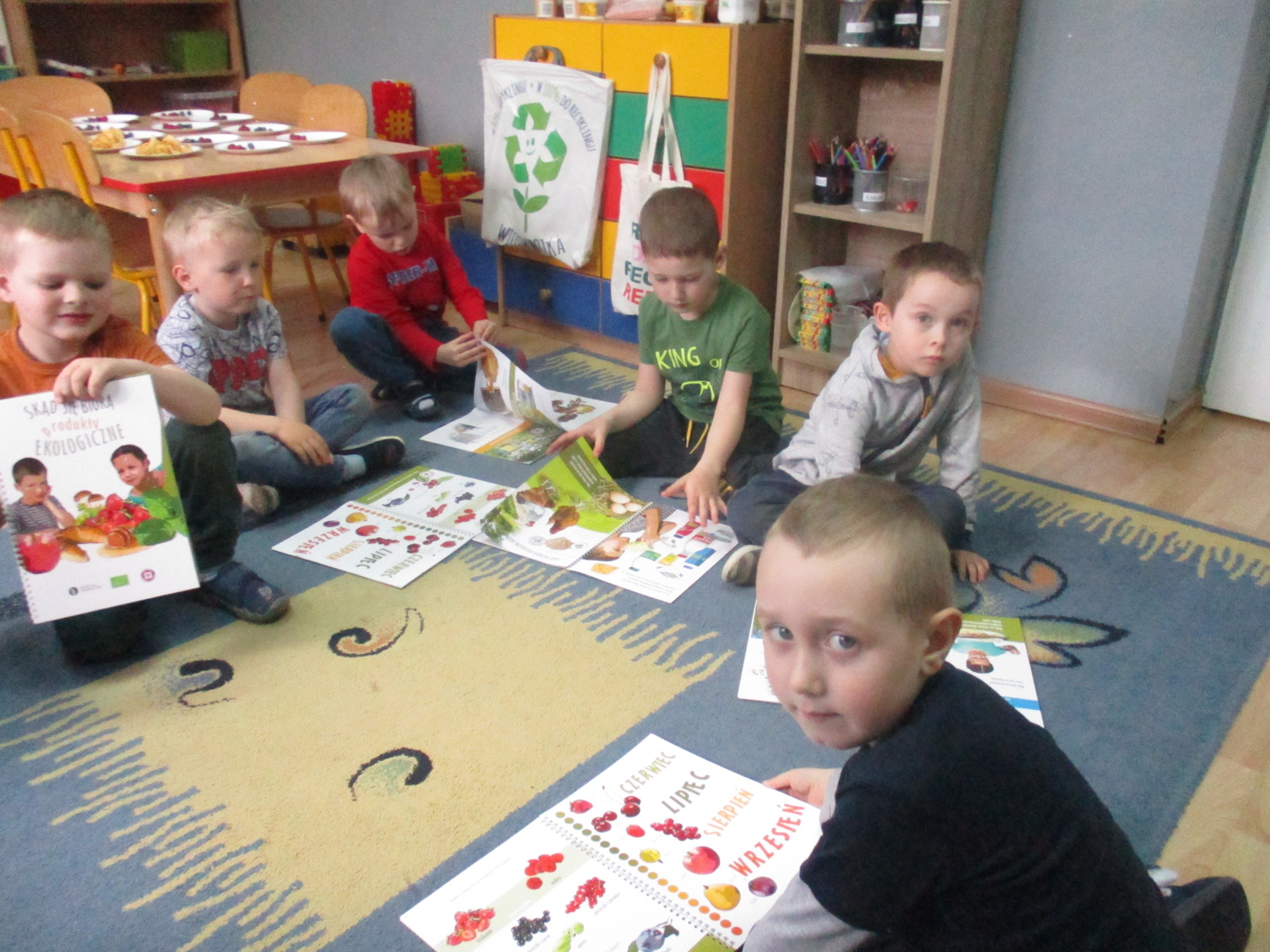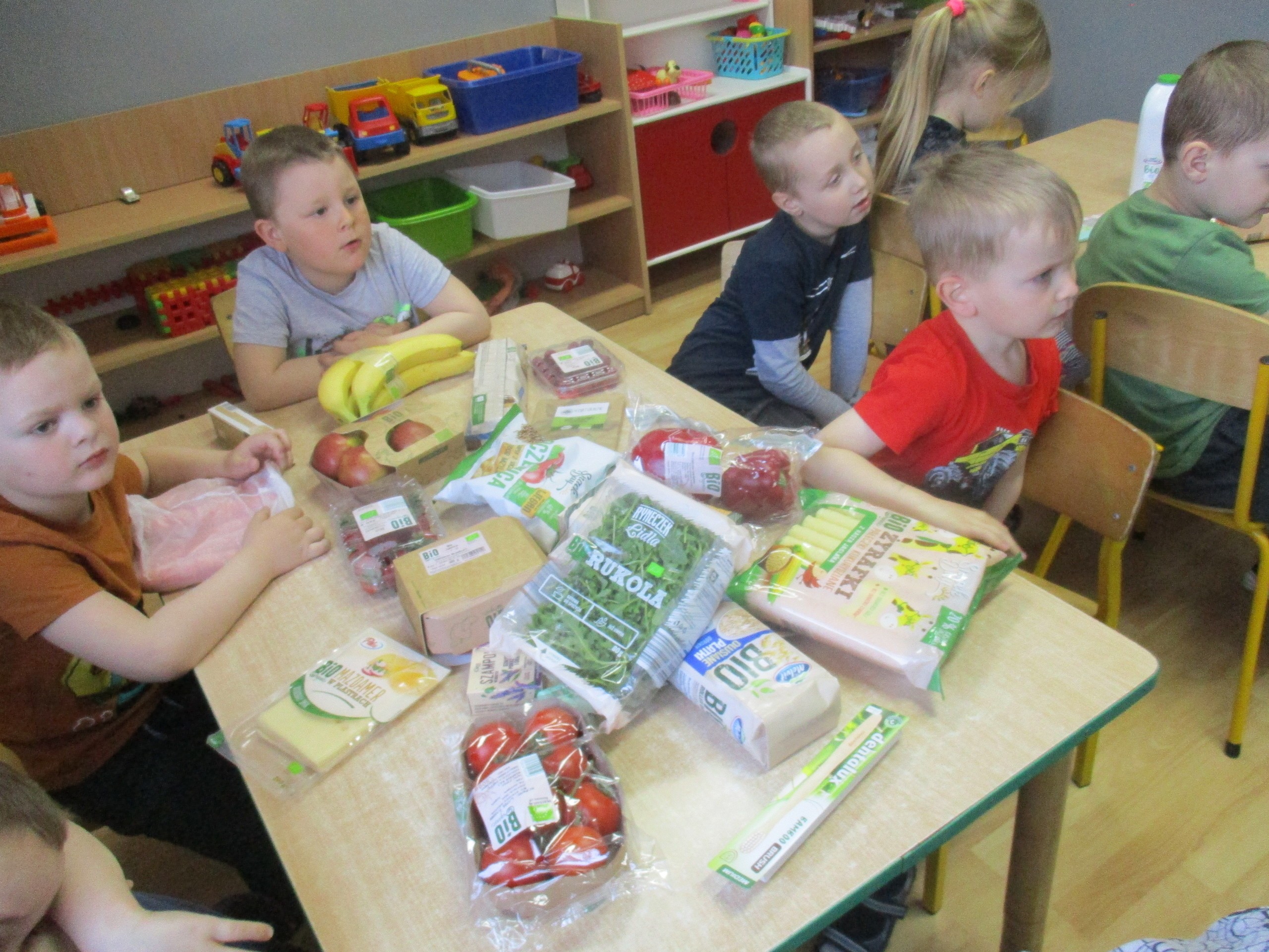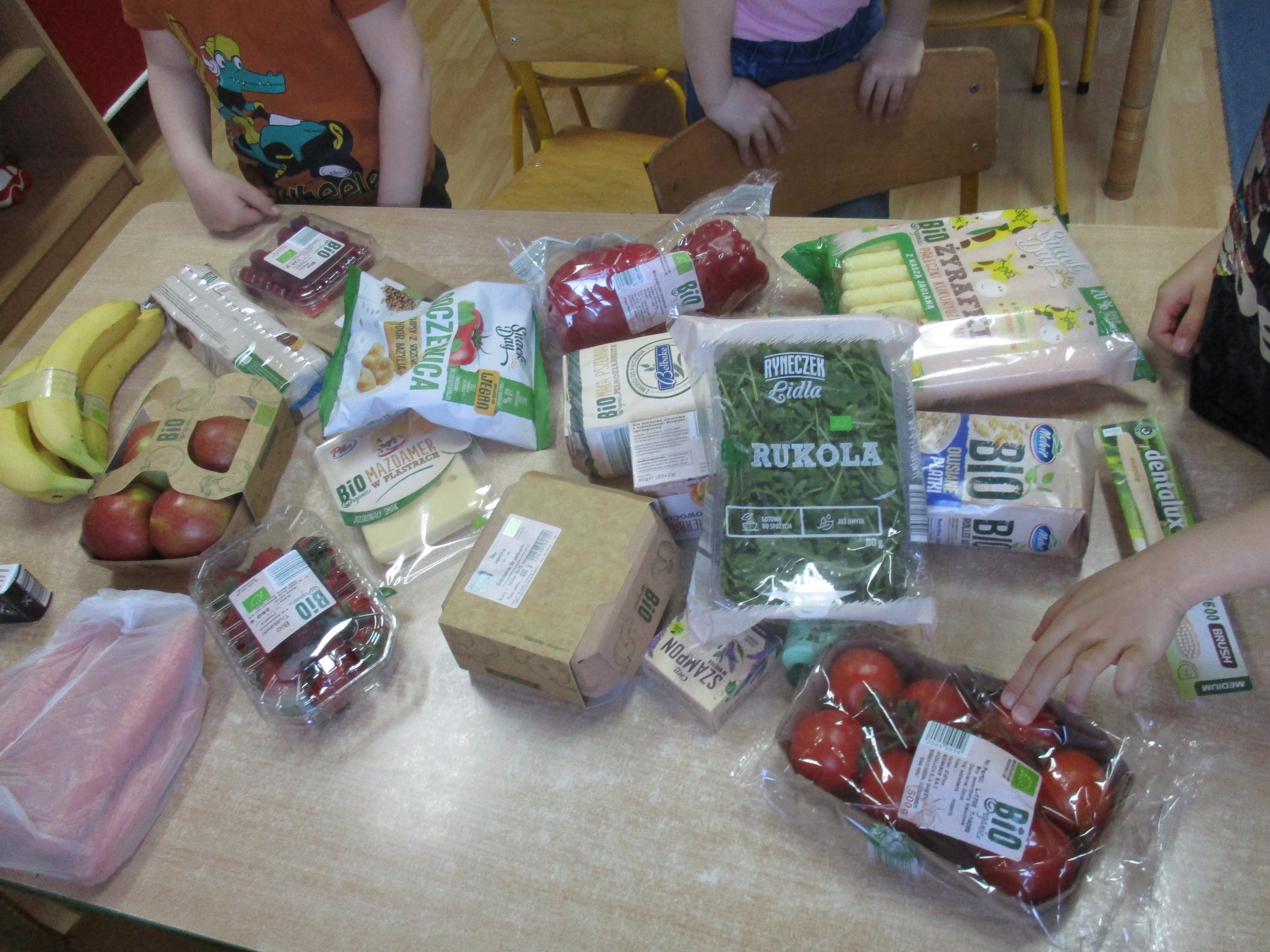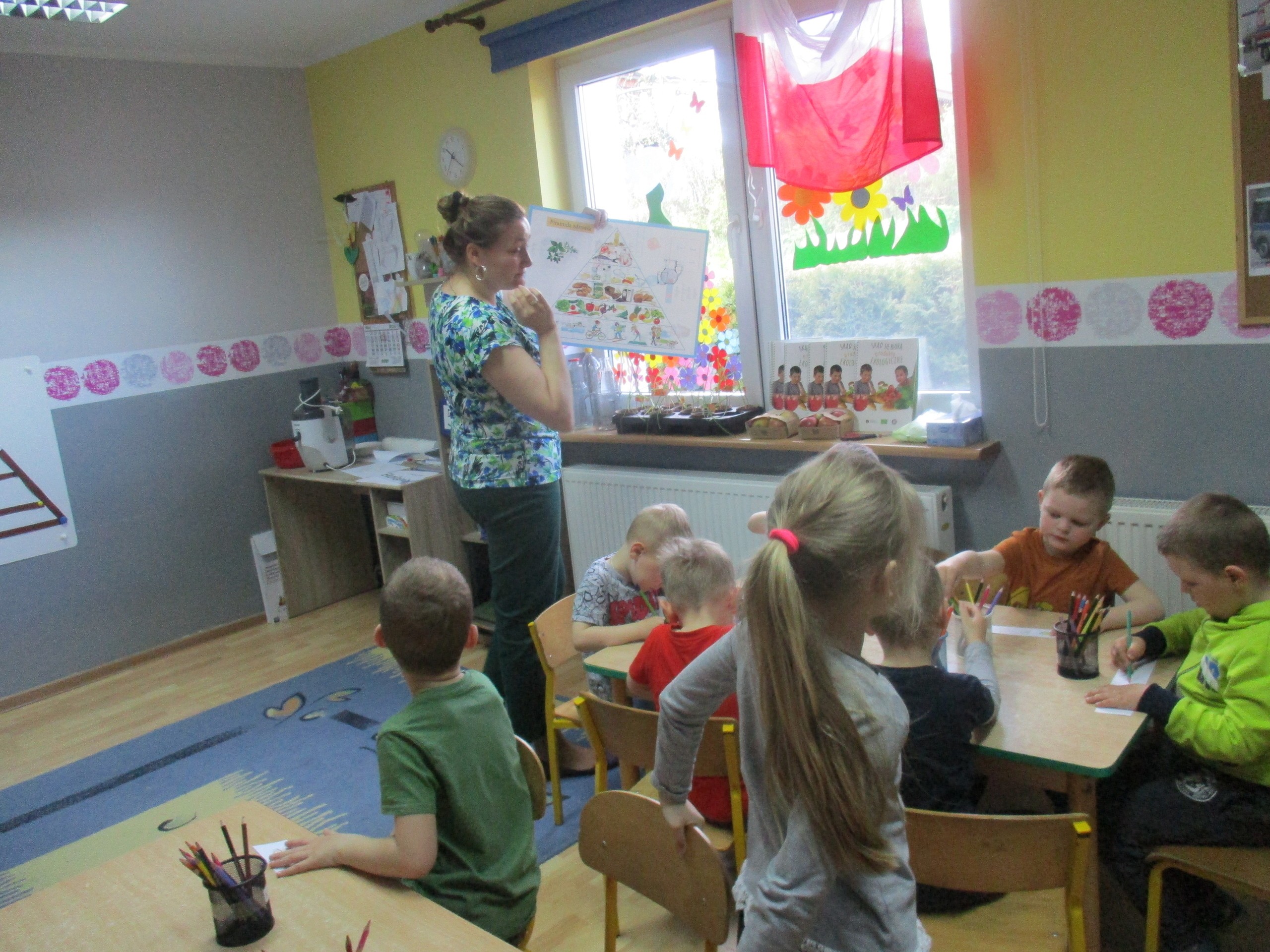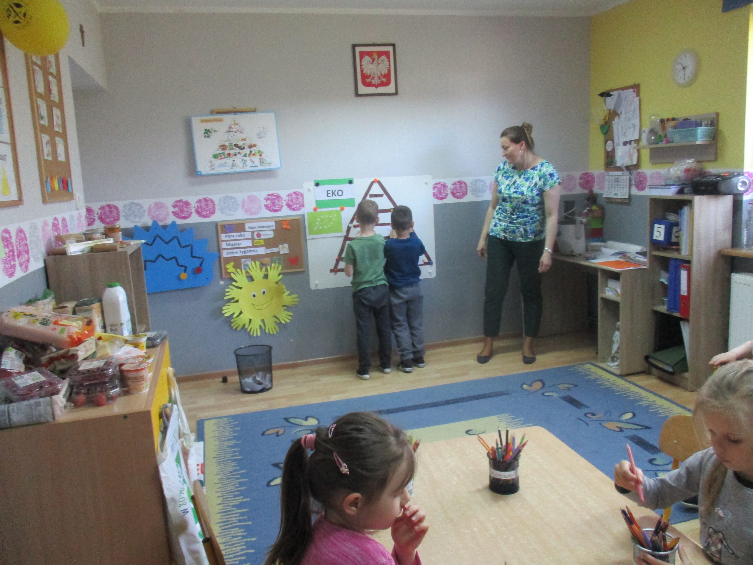 Podczas zajęć dzieci poznały wiele produktów ekologicznych oraz znaczek EKO jaki znajduje się na opakowaniu tych produktów. Obejrzały film pt. “Skąd się biorą produkty ekologiczne?”, uważnie śledząc proces ich powstania. Wspólnie utworzyły Piramidę Zdrowego Żywienia i Stylu Życia oraz realizowały jej zawartość. Spróbowały niektóre produkty ekologiczne np.; chipsy, flipsy, maliny, borówki, marchewkę a także pijąc sok ze świeżo wyciśniętych jabłek.