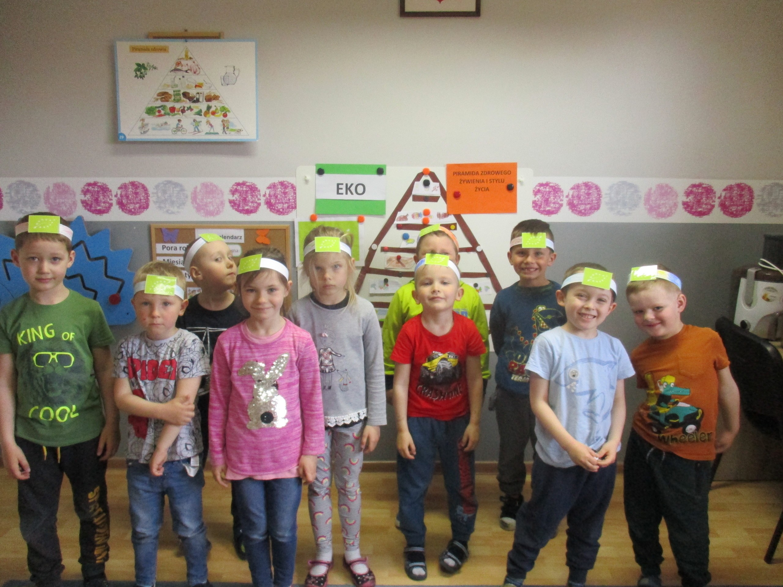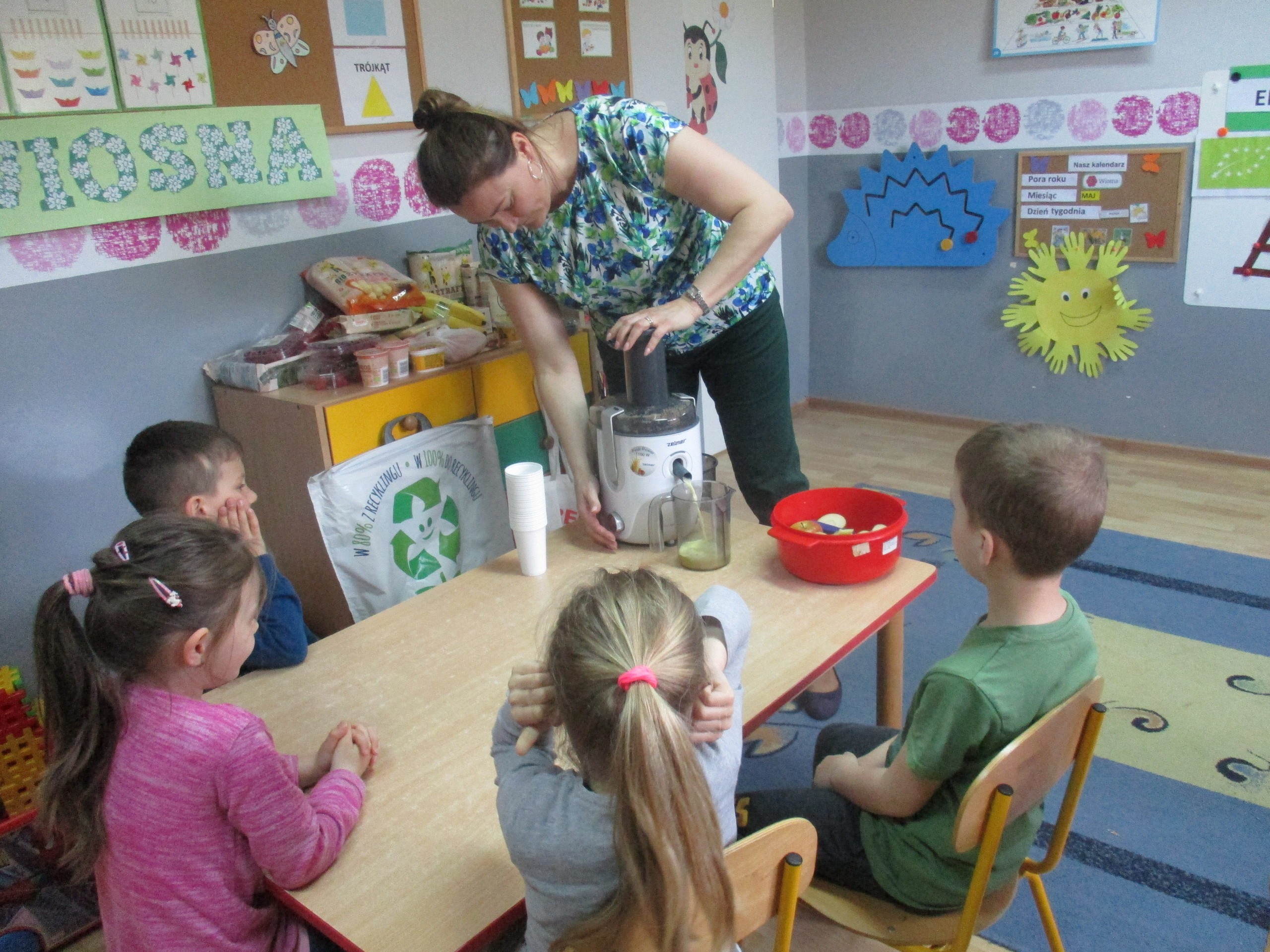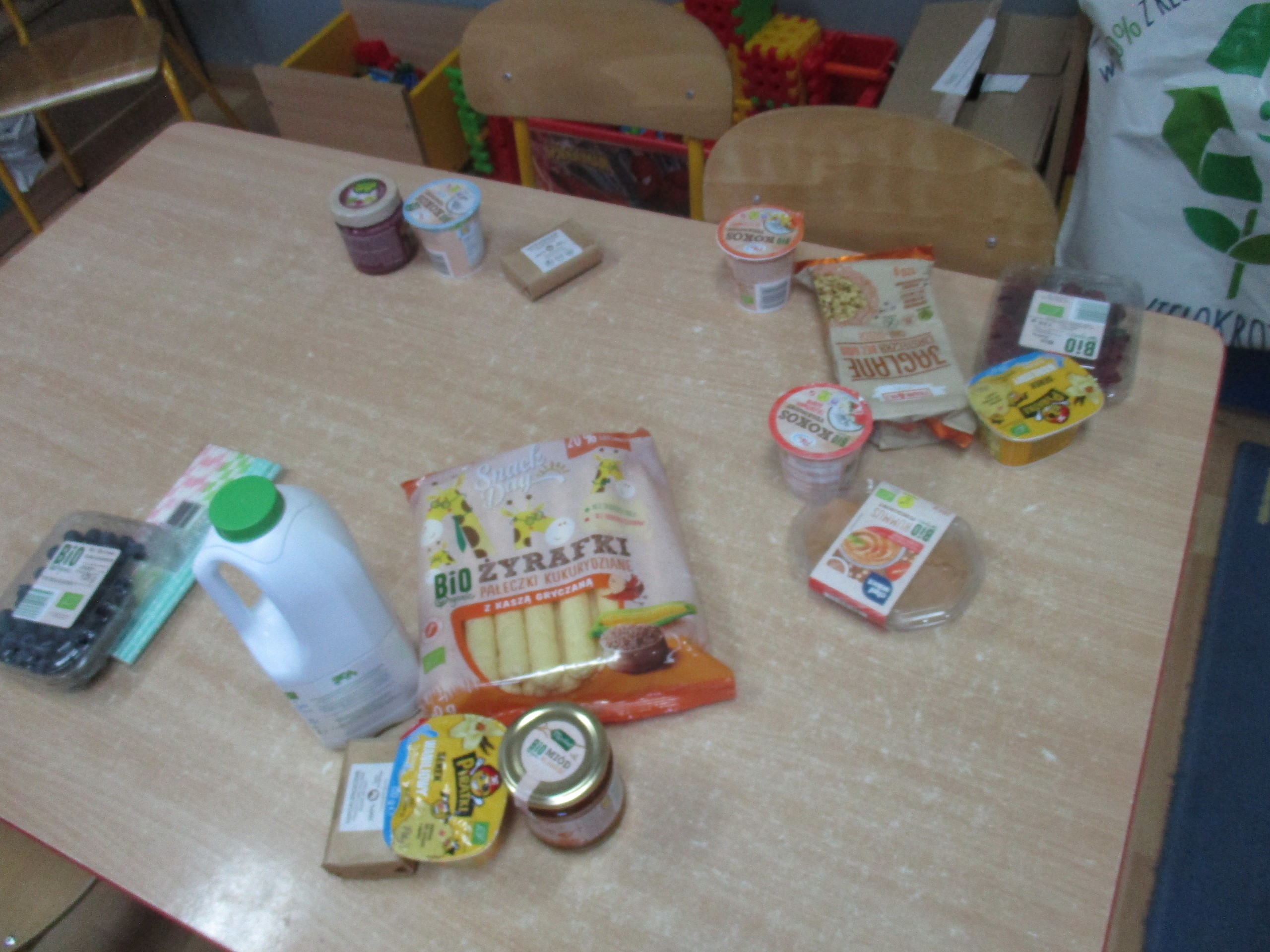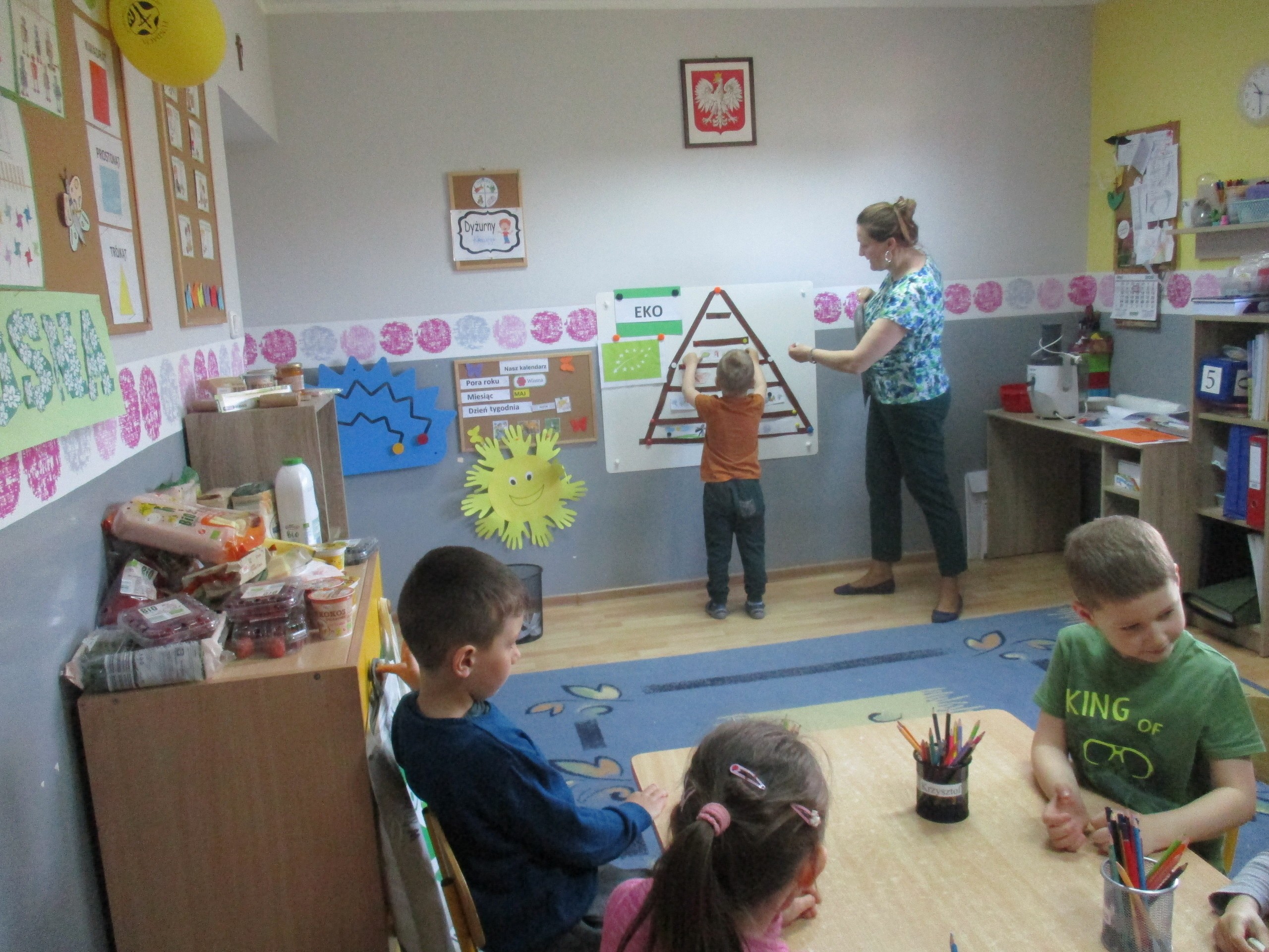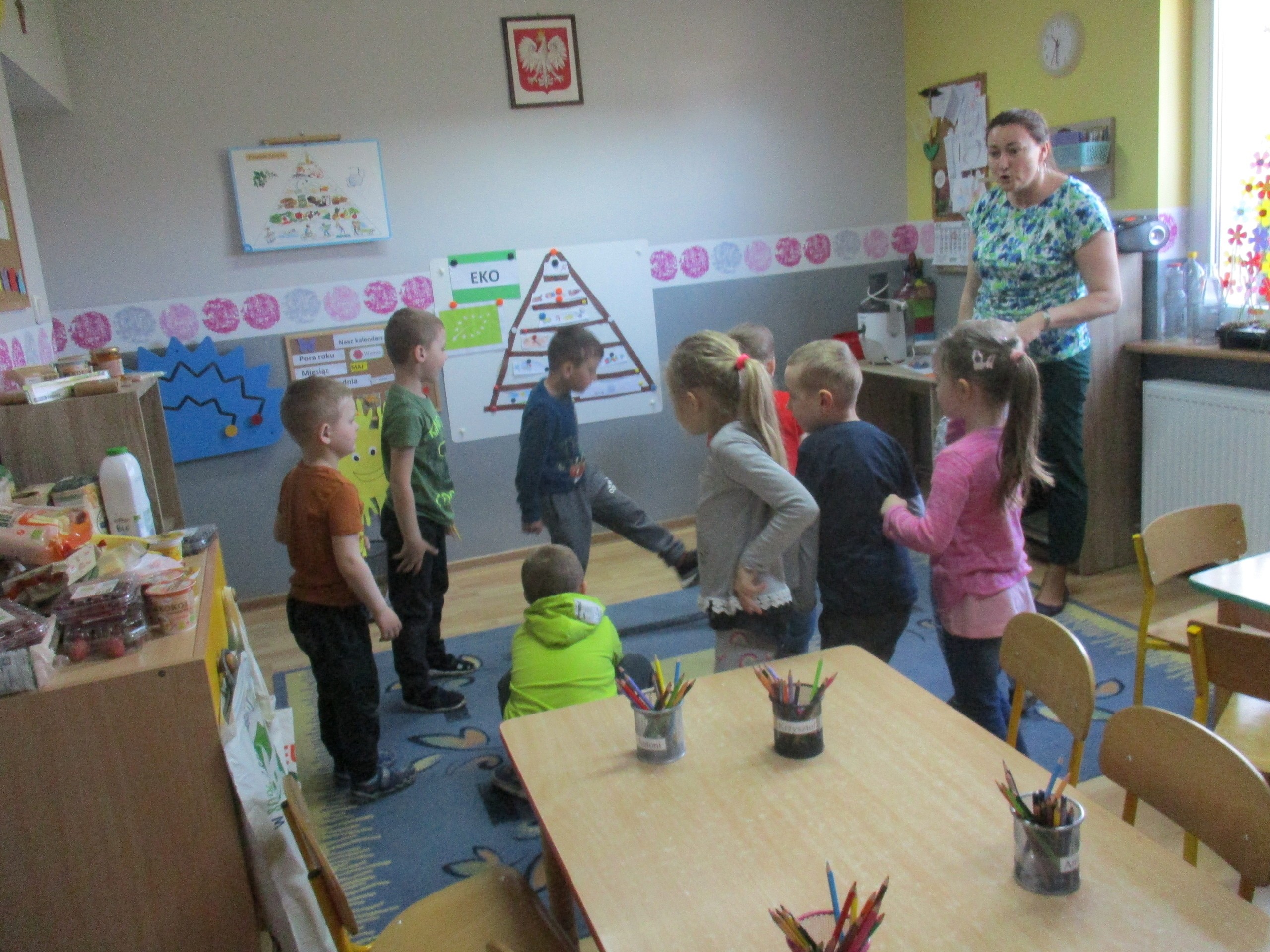 Podczas zajęć dzieci poznały wiele produktów ekologicznych oraz znaczek EKO jaki znajduje się na opakowaniu tych produktów. Obejrzały film pt. “Skąd się biorą produkty ekologiczne?”, uważnie śledząc proces ich powstania. Wspólnie utworzyły Piramidę Zdrowego Żywienia i Stylu Życia oraz realizowały jej zawartość. Spróbowały niektóre produkty ekologiczne np.; chipsy, flipsy, maliny, borówki, marchewkę a także pijąc sok ze świeżo wyciśniętych jabłek.