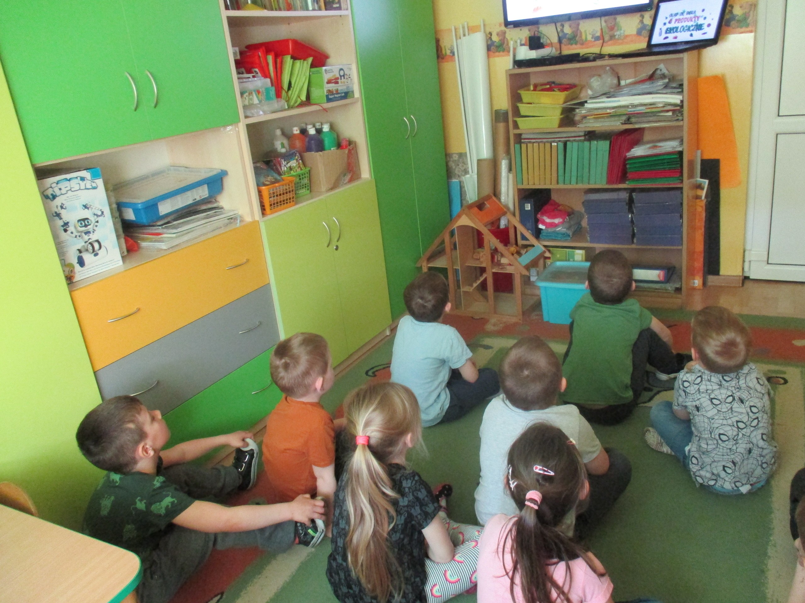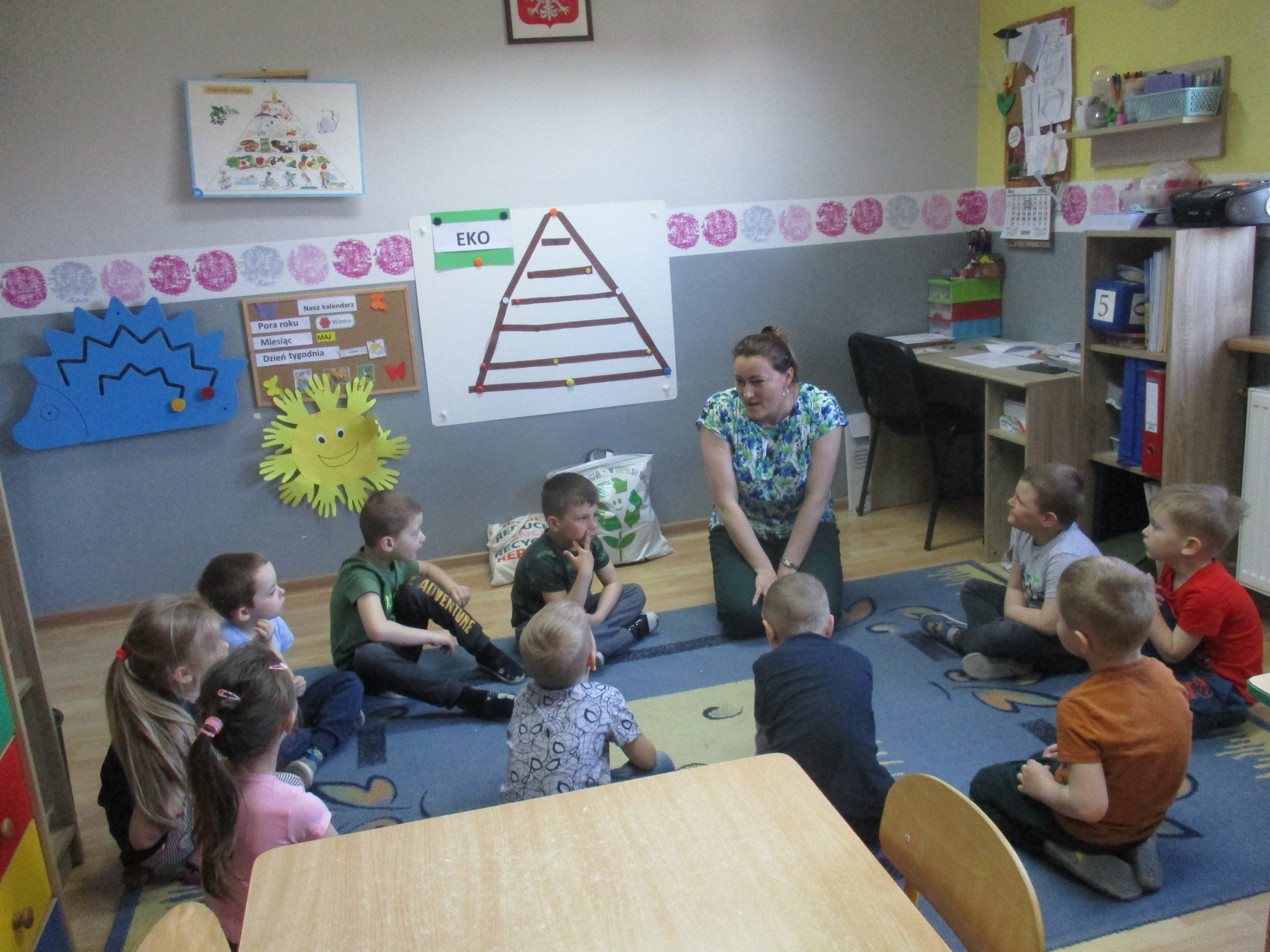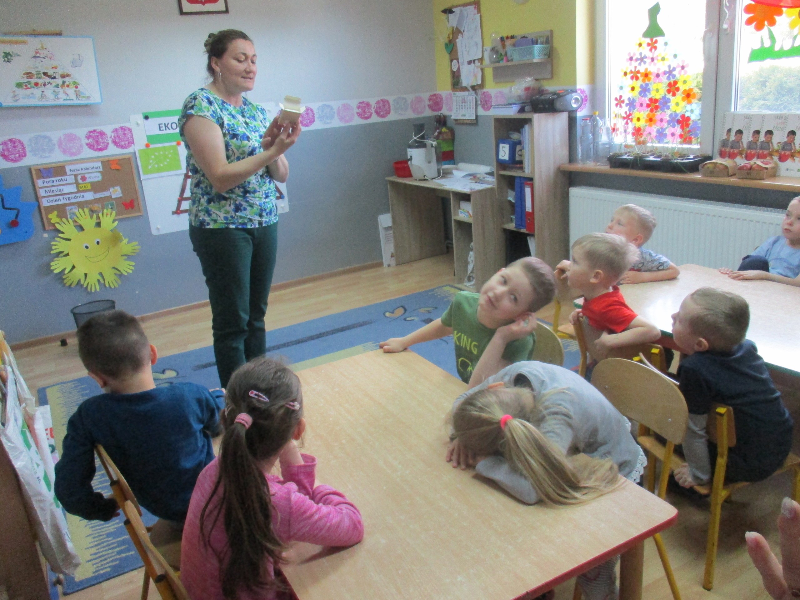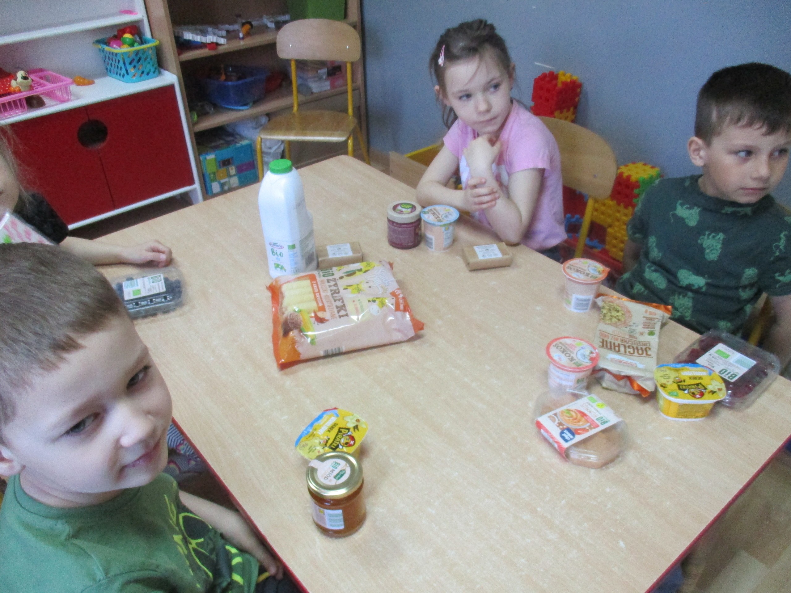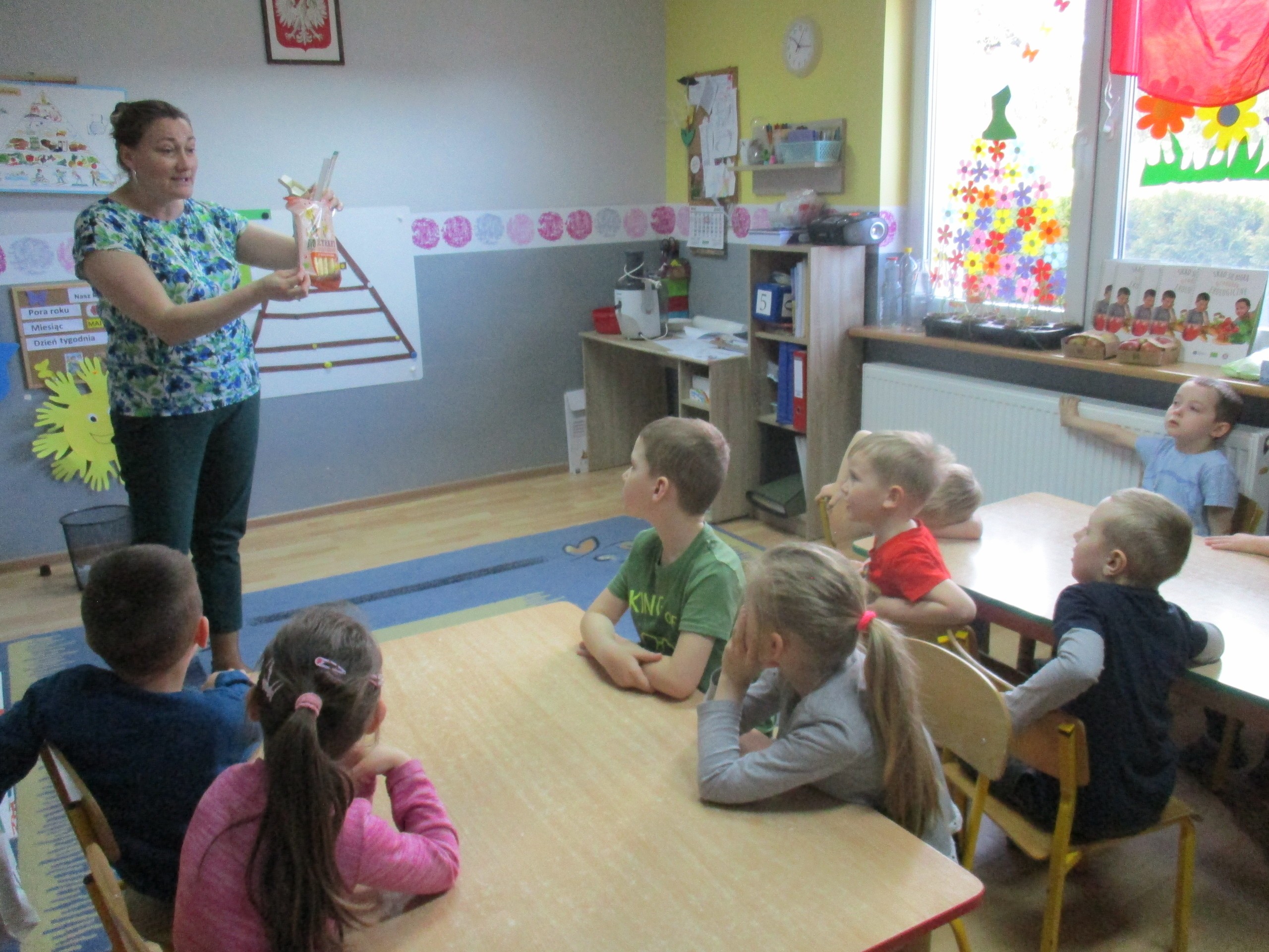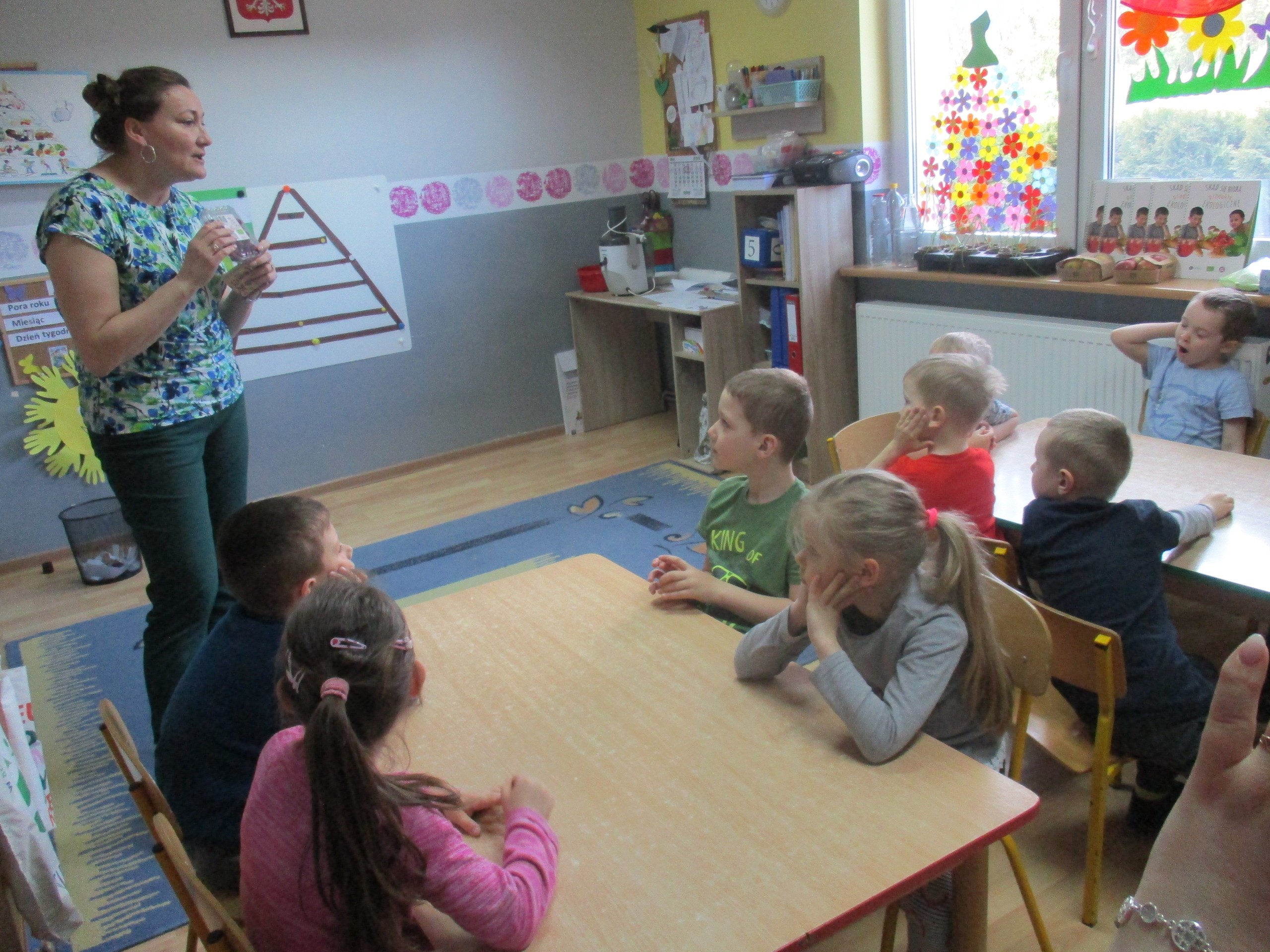 Podczas zajęć dzieci poznały wiele produktów ekologicznych oraz znaczek EKO jaki znajduje się na opakowaniu tych produktów. Obejrzały film pt. “Skąd się biorą produkty ekologiczne?”, uważnie śledząc proces ich powstania. Wspólnie utworzyły Piramidę Zdrowego Żywienia i Stylu Życia oraz realizowały jej zawartość. Spróbowały niektóre produkty ekologiczne np.; chipsy, flipsy, maliny, borówki, marchewkę a także pijąc sok ze świeżo wyciśniętych jabłek.