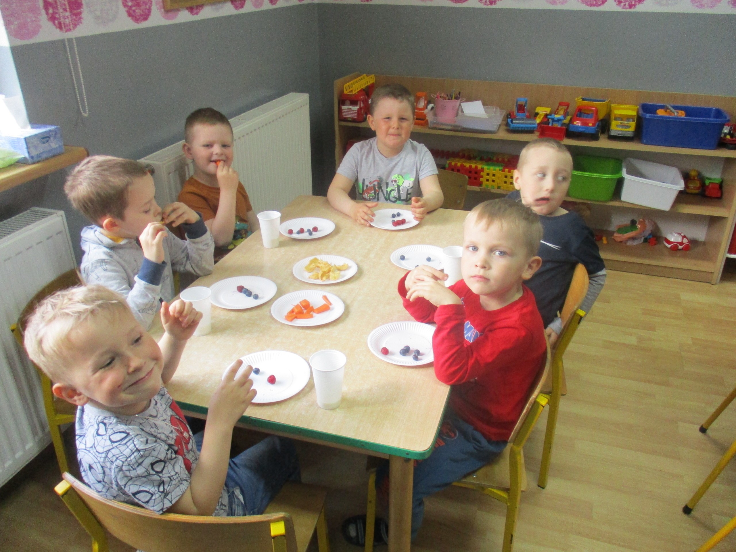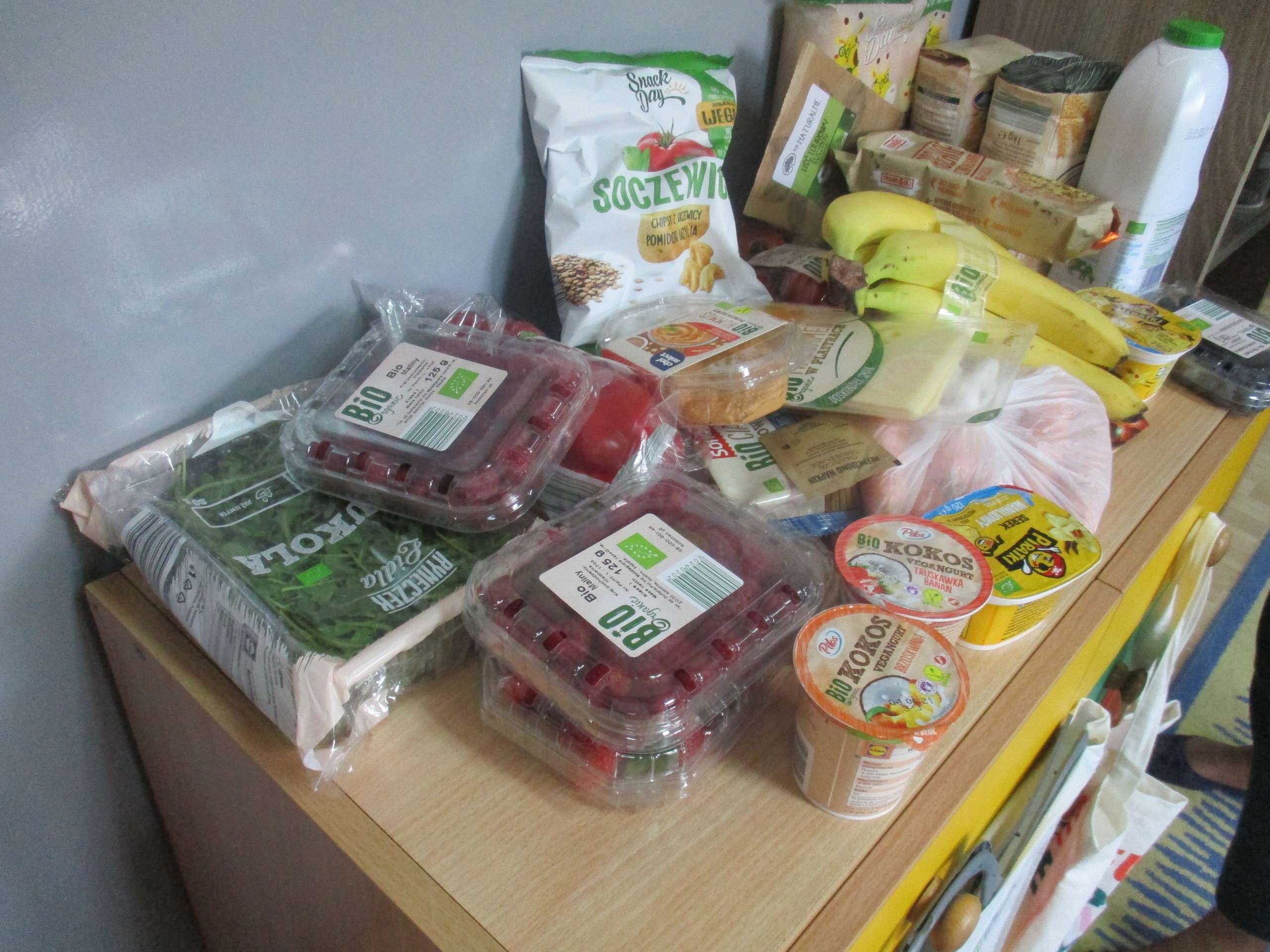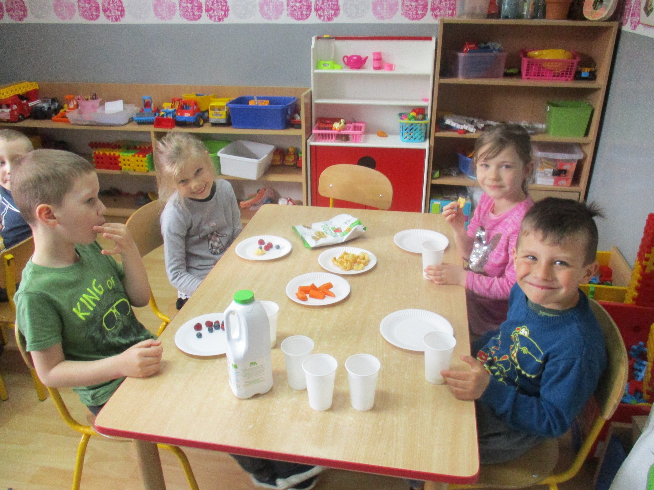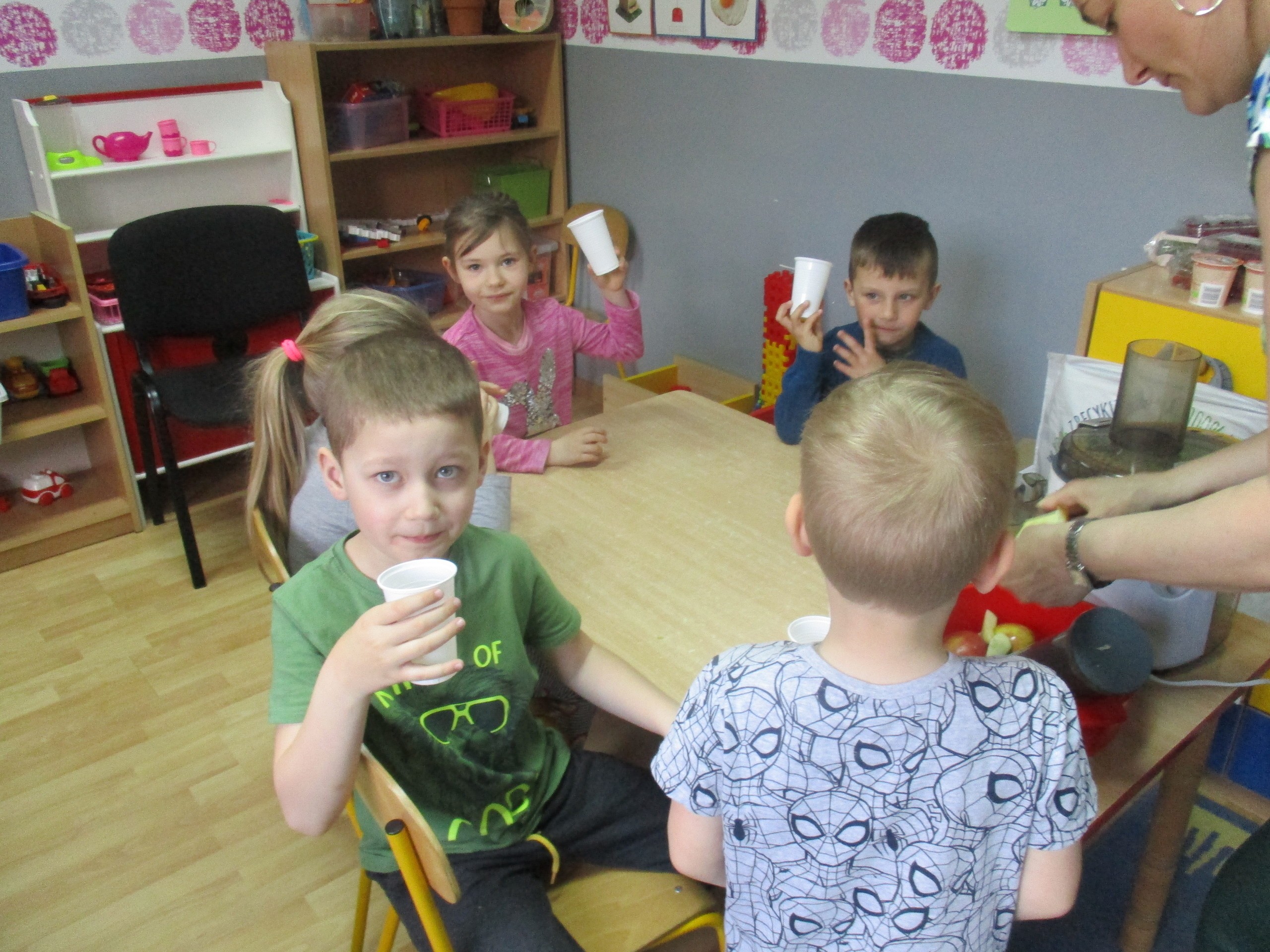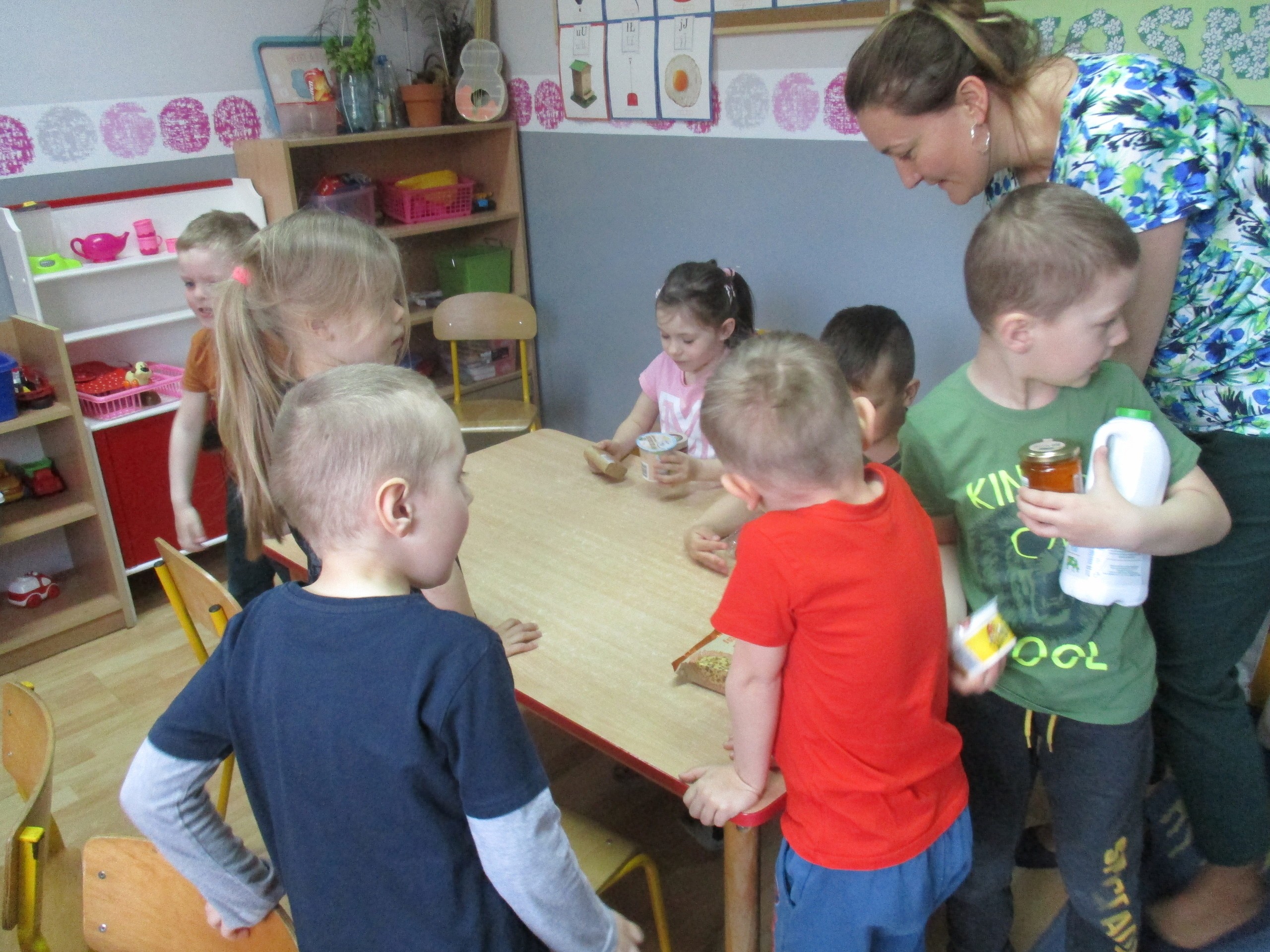 Podczas zajęć dzieci poznały wiele produktów ekologicznych oraz znaczek EKO jaki znajduje się na opakowaniu tych produktów. Obejrzały film pt. “Skąd się biorą produkty ekologiczne?”, uważnie śledząc proces ich powstania. Wspólnie utworzyły Piramidę Zdrowego Żywienia i Stylu Życia oraz realizowały jej zawartość. Spróbowały niektóre produkty ekologiczne np.; chipsy, flipsy, maliny, borówki, marchewkę a także pijąc sok ze świeżo wyciśniętych jabłek.