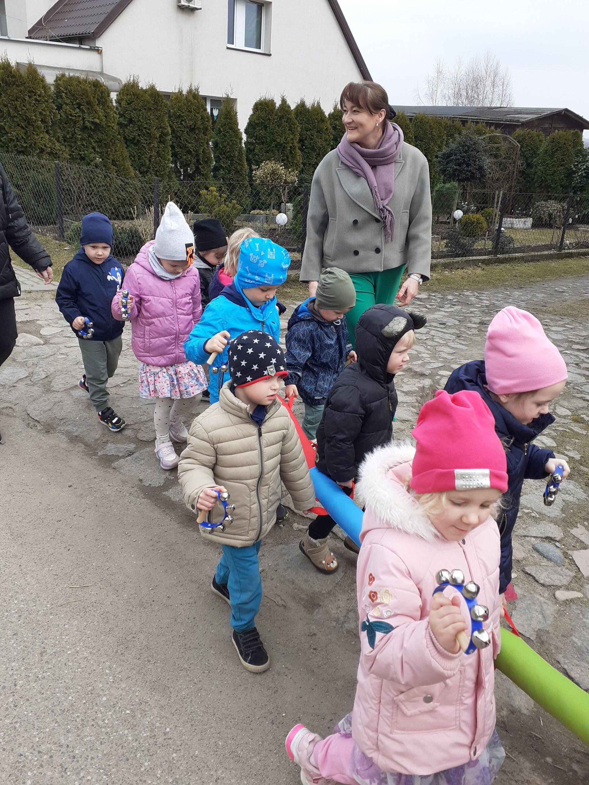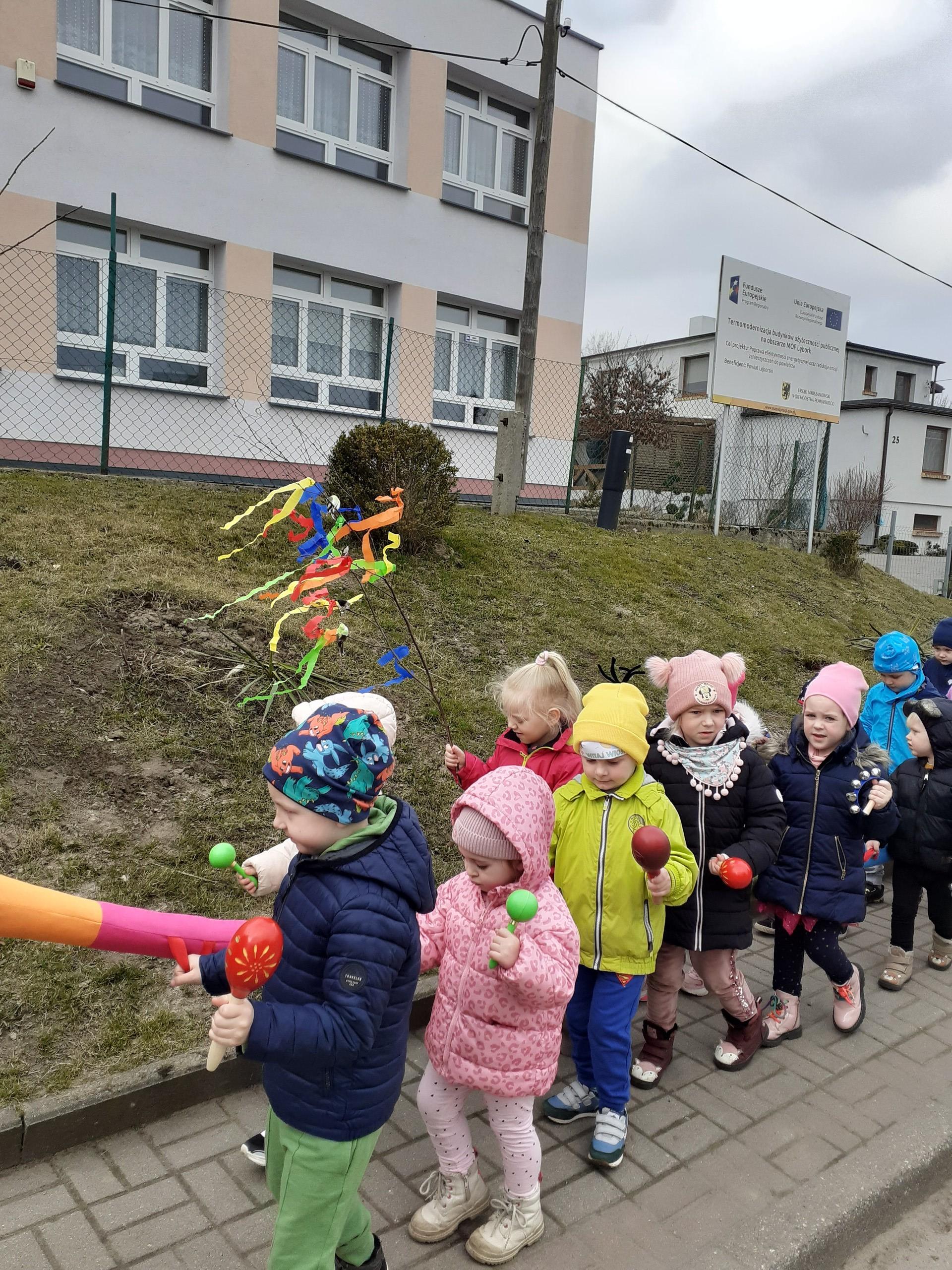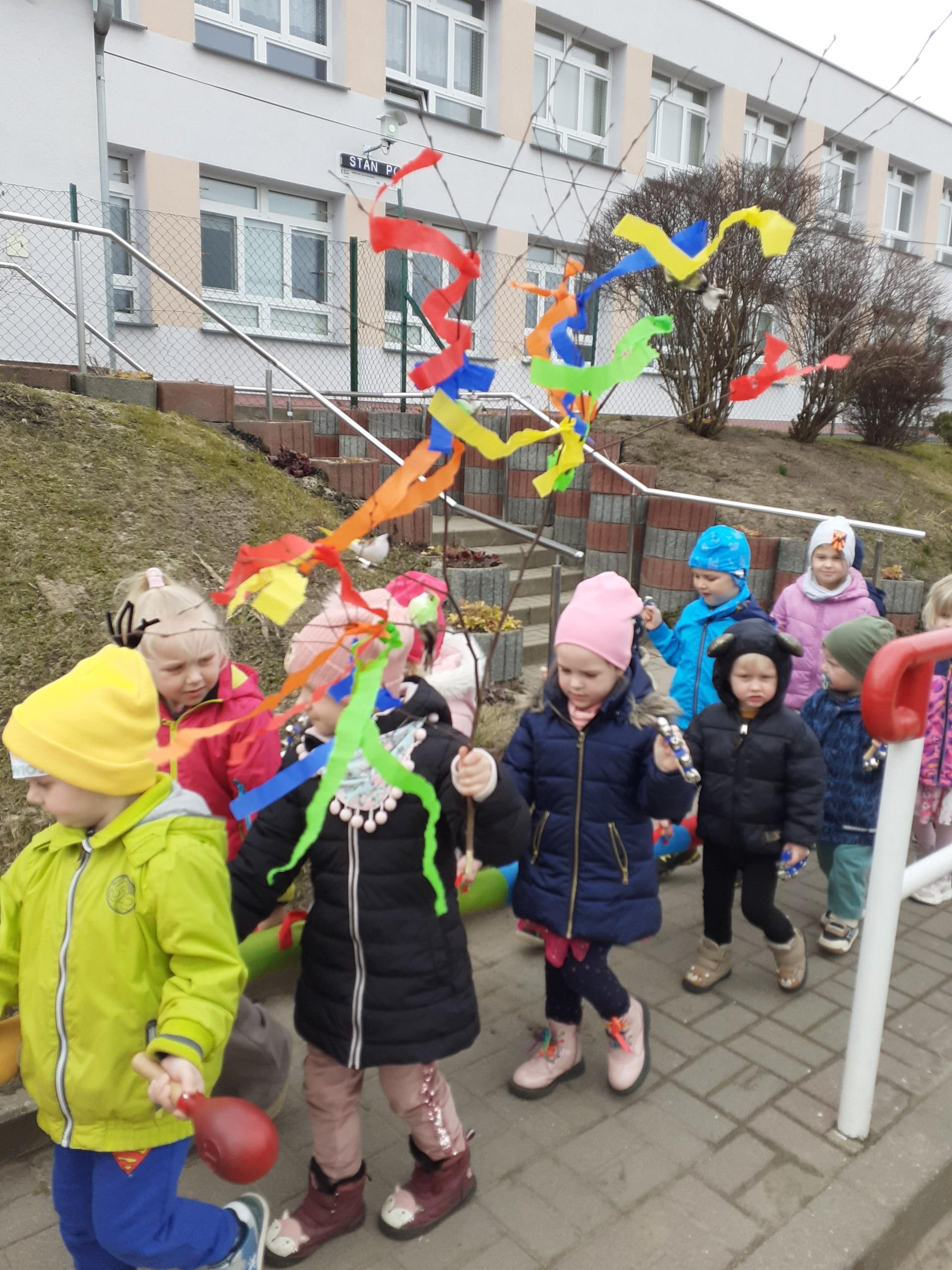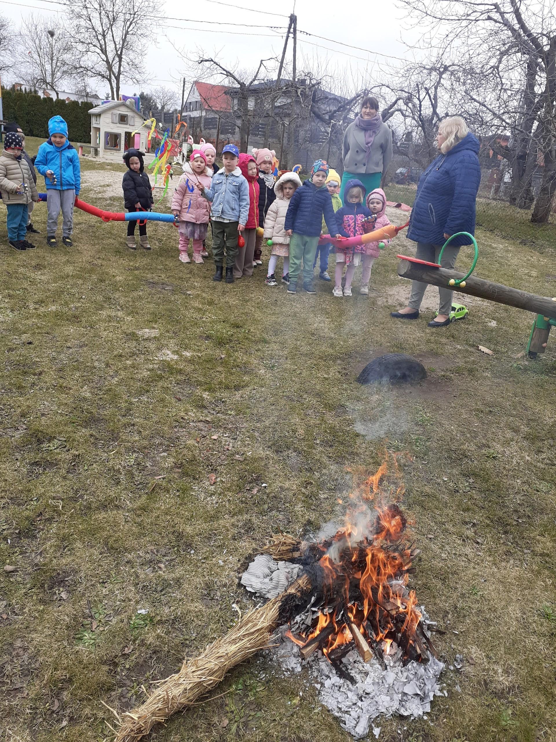 W piątek 20 marca wszystkie dzieci z naszego przedszkola świętowały nadejście wiosny. Dla każdego przedszkolaka jest to bardzo wyczekiwane wydarzenie. Dzień rozpoczęliśmy od rozmów o nowej porze roku oraz od wesołych zabaw przy muzyce. Uśmiechnięci wyruszyliśmy na spacer w okolicy naszego przedszkola, aby pożegnać zimę i przywitać wiosnę. Dzieci próbowały odstraszyć zimę, wołając głośno: Żegnaj zimo, witaj wiosno!!! I tak kolorowy, uśmiechnięty pochód pomaszerował na plac przedszkolny, gdzie przygotowane było ognisko, w którym spłonęła Marzanna - zimowa panna. W ten sposób definitywnie pożegnaliśmy zimę. Mamy nadzieję, że dzięki zaangażowaniu naszych przedszkolaków wiosna zawita do nas na dobre, a wraz z nią ciepłe dni, z których będziemy czerpać radość.